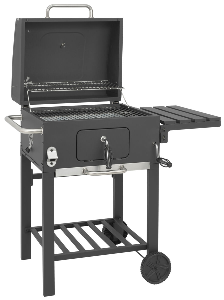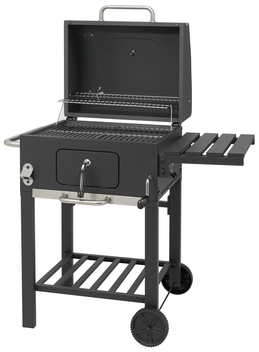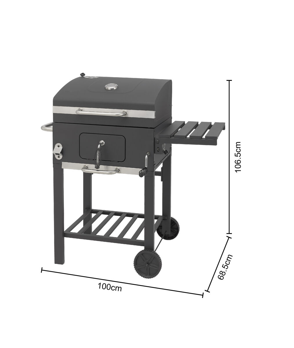 Disfruta de auténticas parrilladas con la barbacoa de jardín KOA en elegante negro e inox. Su sólida estructura de acero con tapa mide 100x106,5x70cm, ofreciendo espacio y resistencia. Equipada con parrilla regulable en altura, termómetro integrado y bandeja para cenizas para un uso práctico y seguro. Incluye abrebotellas y estante lateral plegable, perfectos para mayor comodidad. Ideal para compartir momentos al aire libre con familia y amigos.