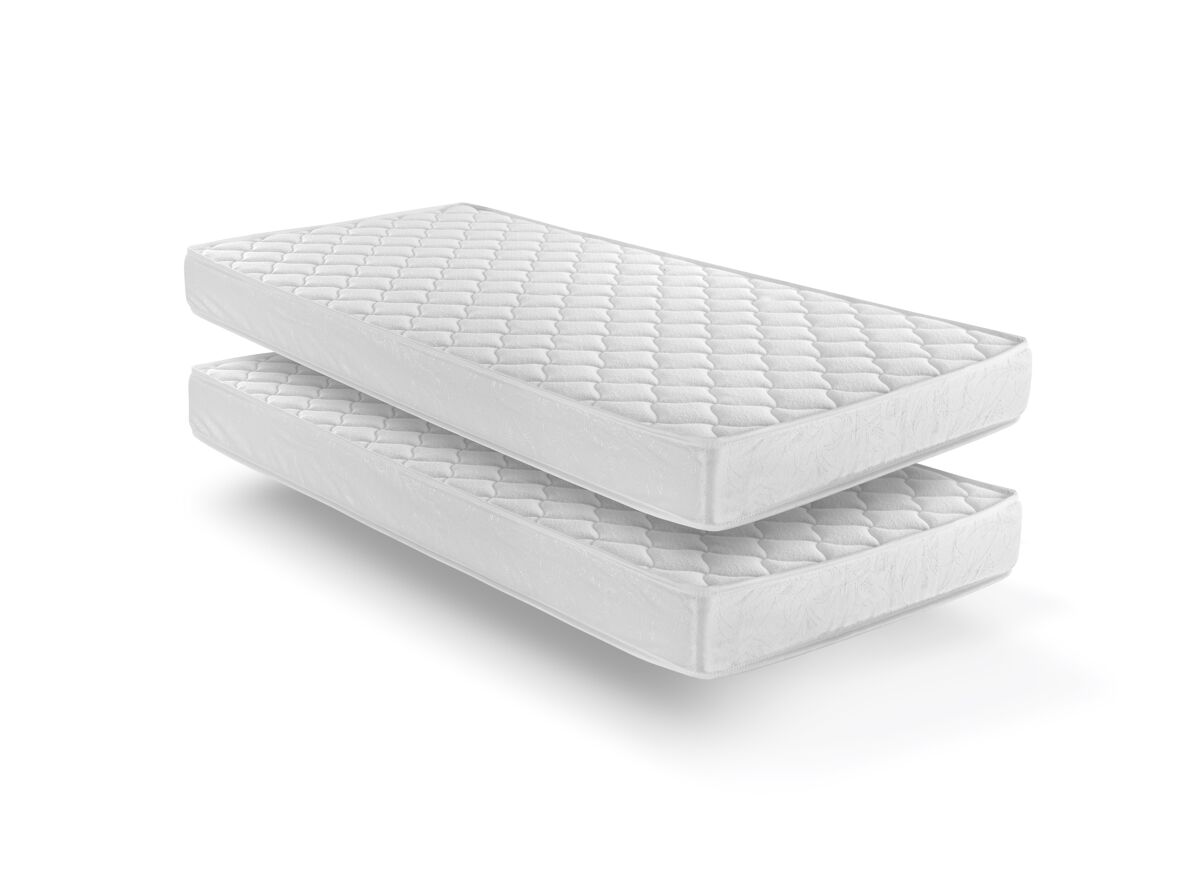Pack de 2 colchones de espuma con núcleo HR de 20kg, de alta densidad con celdas abiertas, proporcionando confort y transpirabilidad. Este pack de colchones es perfecto para la cama UPPSALA. Tapa A acolchada con tejido damasco, extra suave, acolchado en 200 gramos de fibra atérmica, que mejora la adaptabilidad y regula la humedad del colchón. Tapa B en tejido 3D extra suave y acolchado en fibra atérmica 200g. Platabanda en tejido damasco. Altura aproximada de 14cm, pudiendo variar en función de la compresión de ajuste de cierre y lugar de medición. Este colchón está fabricado para niños con un peso recomendado de hasta 60kg.